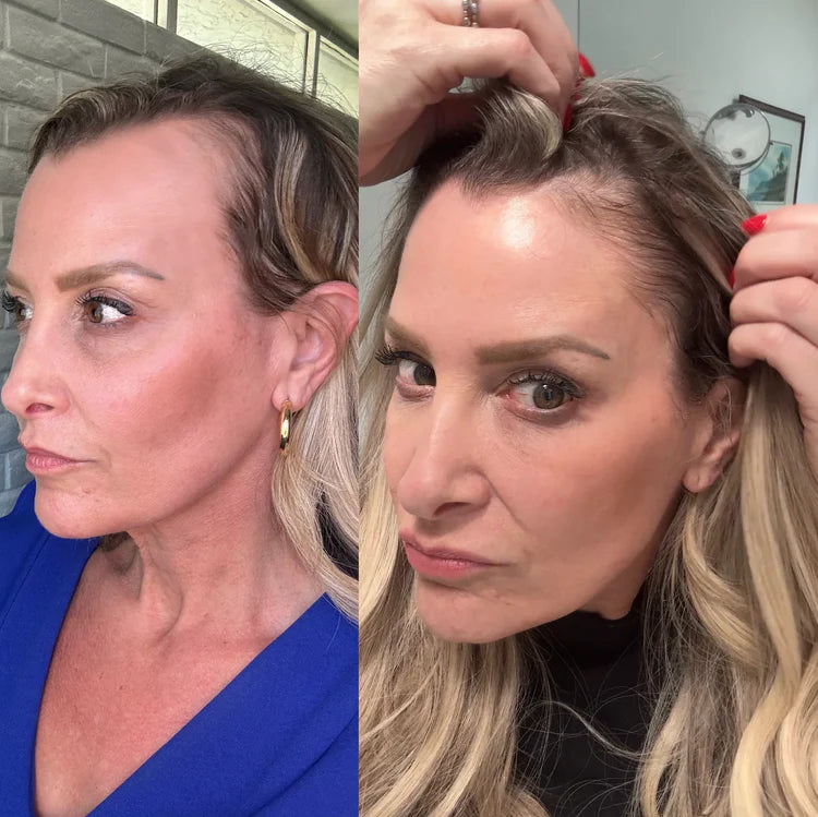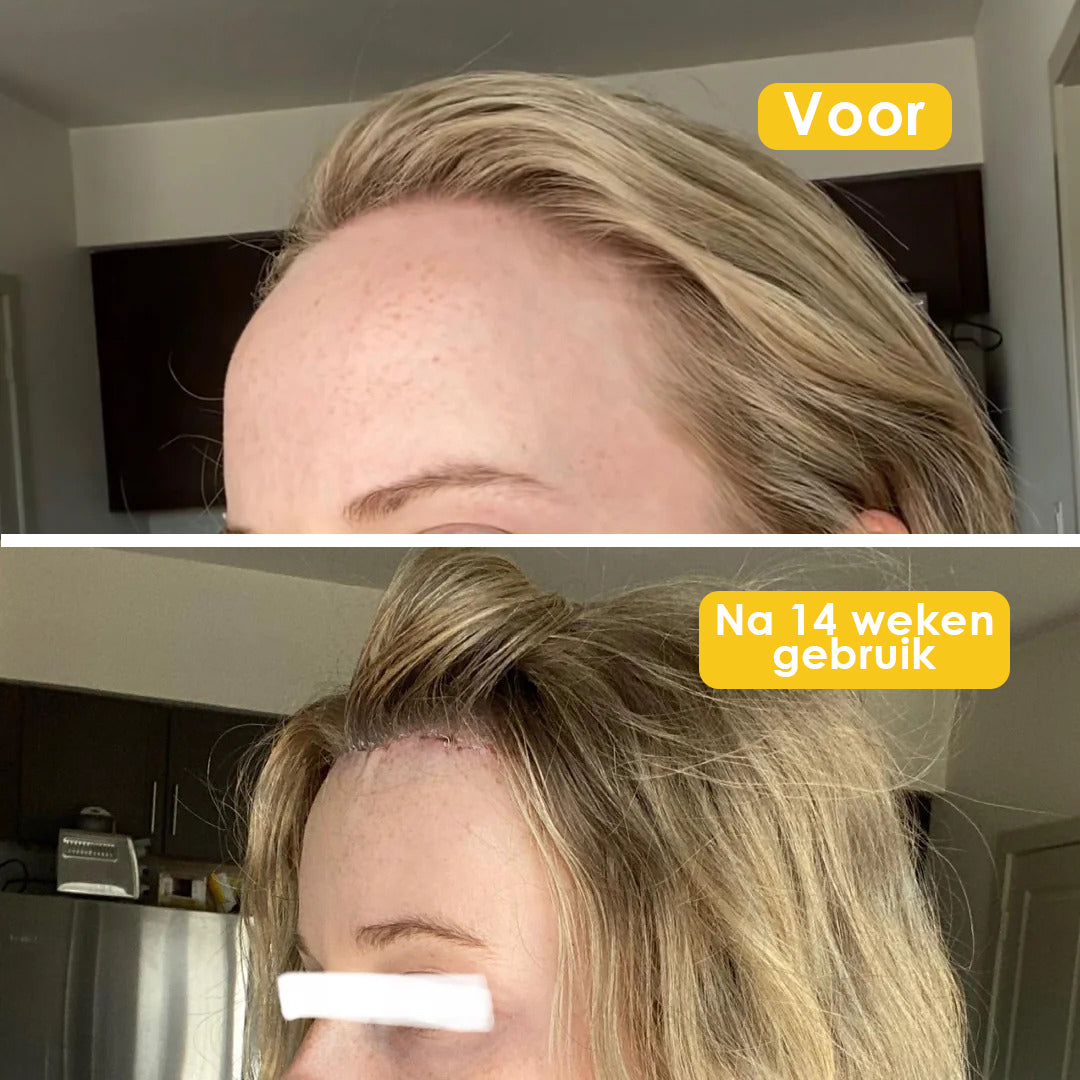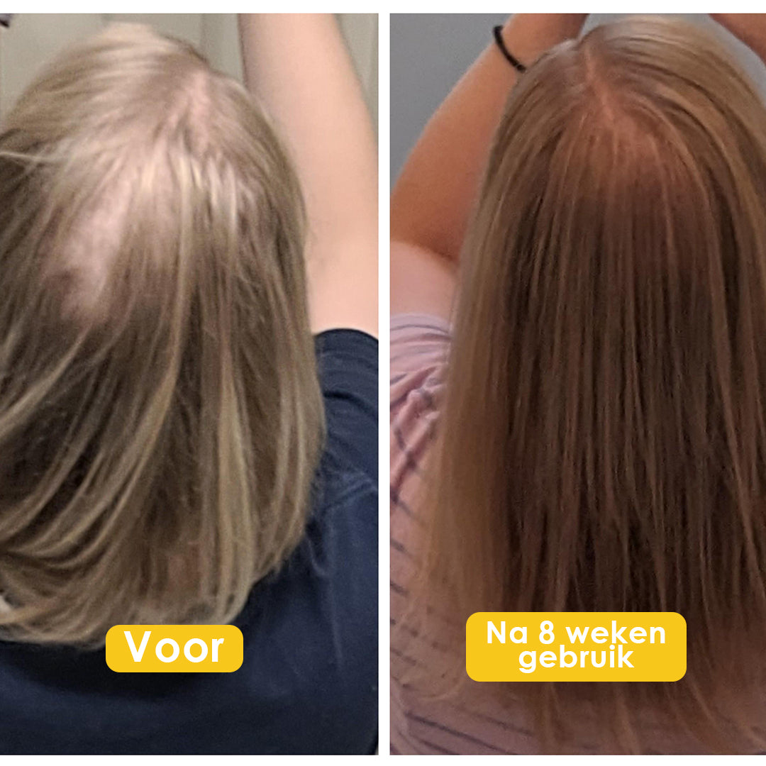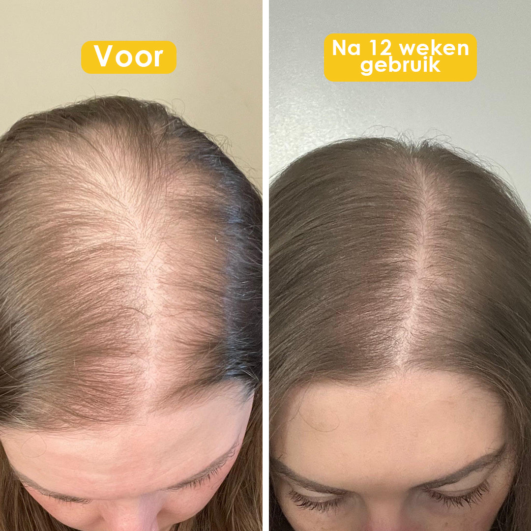 Het haar oogt zichtbaar voller rond de haarlijn en kruin, met meer body en lift bij de aanzet. Bij regelmatig gebruik voelt de hoofdhuid gezonder aan en lijkt het haar dichter, sterker en vitaler.