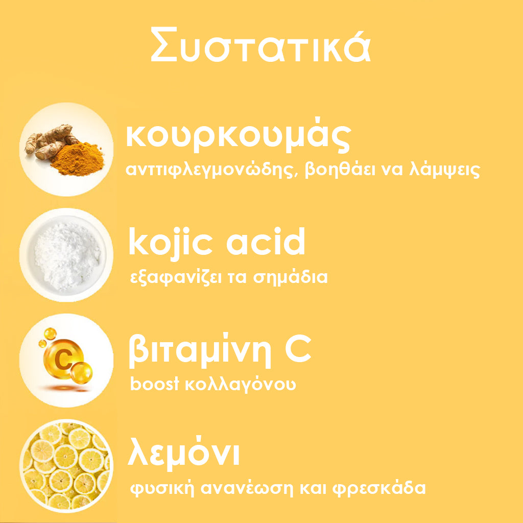 Το σαπούνι μας με turmeric (κουρκουμάς) & kojic acid χαρίζει πιο φωτεινή, ομοιόμορφη και υγιή επιδερμίδα χάρη στο μοναδικό του μείγμα ενεργών συστατικών.